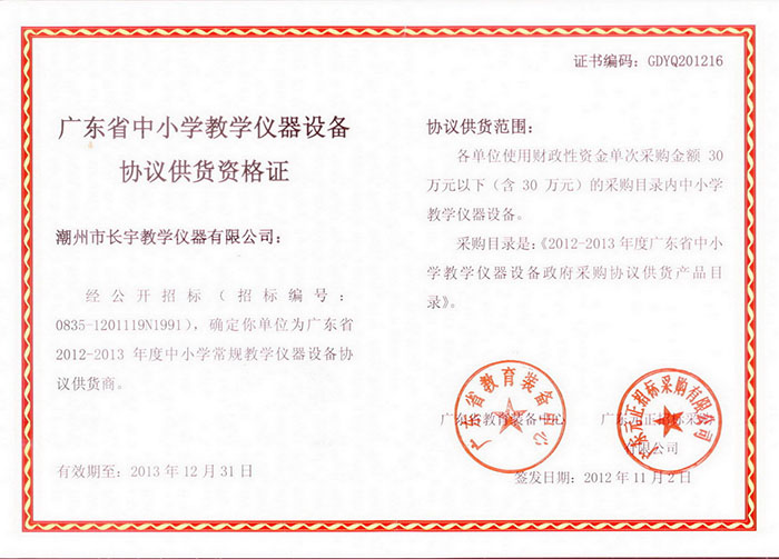 Primary and secondary school teaching instruments and equipment supply agreement certificate in guangdong province